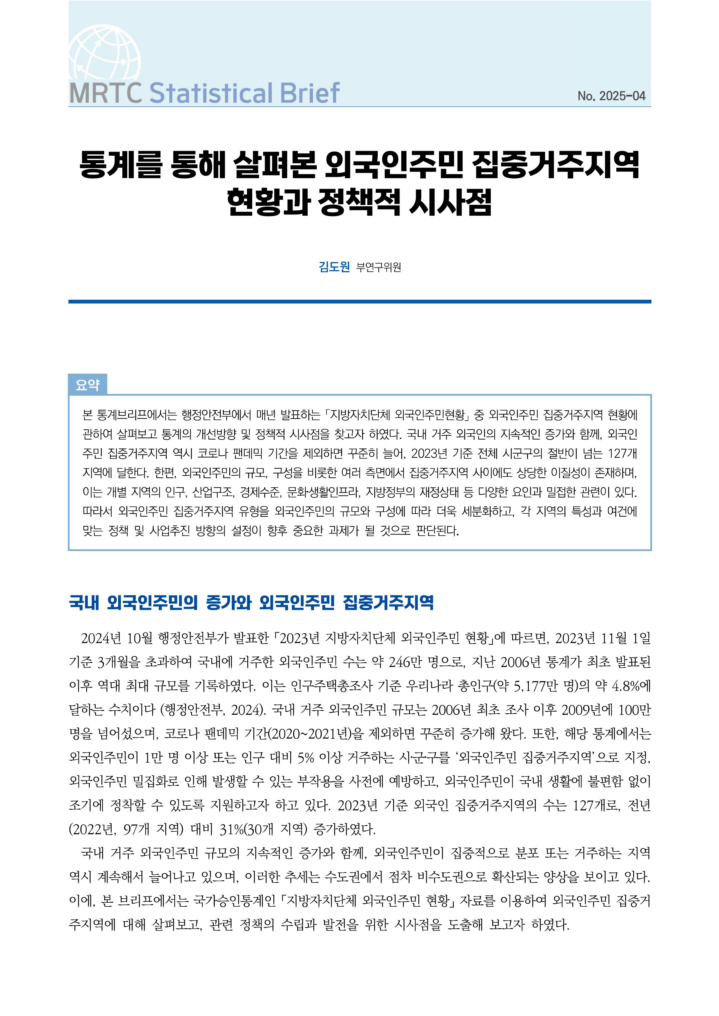 본 통계브리프에서는 행정안전부에서 매년 발표하는 「지방자치단체 외국인주민현황」 중 외국인주민 집중거주지역 현황에 관하여 살펴보고 통계의 개선방향 및 정책적 시사점을 찾고자 하였다. 국내 거주 외국인의 지속적인 증가와 함께, 외국인 주민 집중거주지역 역시 코로나 팬데믹 기간을 제외하면 꾸준히 늘어, 2023년 기준 전체 시군구의 절반이 넘는 127개 지역에 달한다. 한편, 외국인주민의 규모, 구성을 비롯한 여러 측면에서 집중거주지역 사이에도 상당한 이질성이 존재하며, 이는 개별 지역의 인구, 산업구조, 경제수준, 문화‧생활인프라, 지방정부의 재정상태 등 다양한 요인과 밀접한 관련이 있다. 따라서 외국인주민 집중거주지역 유형을 외국인주민의 규모와 구성에 따라 더욱 세분화하고, 각 지역의 특성과 여건에 맞는 정책 및 사업추진 방향의 설정이 향후 중요한 과제가 될 것으로 판단된다.