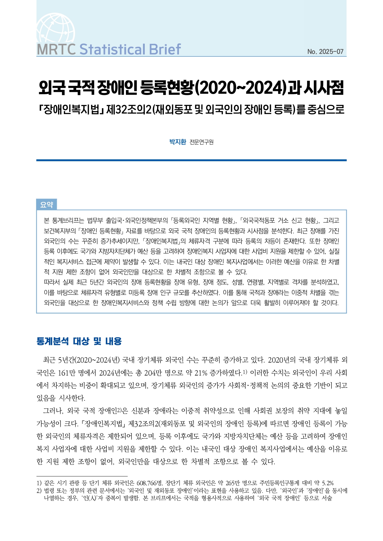 본 통계브리프는 법무부 출입국・외국인정책본부의 「등록외국인 지역별 현황」, 「외국국적동포 거소 신고 현황」, 그리고 보건복지부의 「장애인 등록현황」 자료를 바탕으로 외국 국적 장애인의 등록현황과 시사점을 분석한다. 최근 장애를 가진 외국인의 수는 꾸준히 증가추세이지만, 「장애인복지법」의 체류자격 구분에 따라 등록의 차등이 존재한다. 또한 장애인 등록 이후에도 국가와 지방자치단체가 예산 등을 고려하여 장애인복지 사업자에 대한 사업비 지원을 제한할 수 있어, 실질 적인 복지서비스 접근에 제약이 발생할 수 있다. 이는 내국인 대상 장애인 복지사업에서는 이러한 예산을 이유로 한 차별 적 지원 제한 조항이 없어 외국인만을 대상으로 한 차별적 조항으로 볼 수 있다.