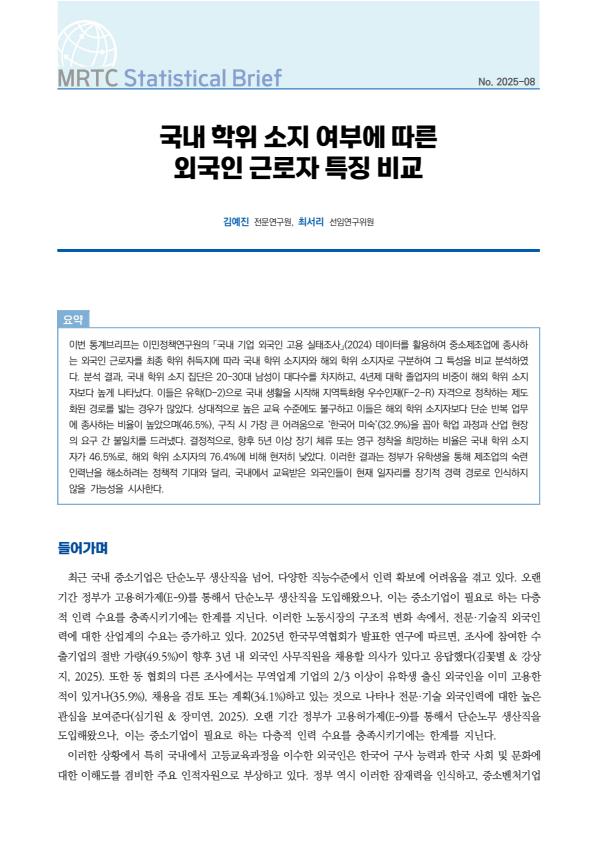 이번 통계브리프는 이민정책연구원의 「국내 기업 외국인 고용 실태조사」(2024) 데이터를 활용하여 중소제조업에 종사하는 외국인 근로자를 최종 학위 취득지에 따라 국내 학위 소지자와 해외 학위 소지자로 구분하여 그 특성을 비교 분석하였다. 분석 결과, 국내 학위 소지 집단은 20-30대 남성이 대다수를 차지하고, 4년제 대학 졸업자의 비중이 해외 학위 소지자보다 높게 나타났다. 이들은 유학(D-2)으로 국내 생활을 시작해 지역특화형 우수인재(F-2-R) 자격으로 정착하는 제도화된 경로를 밟는 경우가 많았다. 상대적으로 높은 교육 수준에도 불구하고 이들은 해외 학위 소지자보다 단순 반복 업무에 종사하는 비율이 높았으며(46.5%), 구직 시 가장 큰 어려움으로 ‘한국어 미숙’(32.9%)을 꼽아 학업 과정과 산업 현장의 요구 간 불일치를 드러냈다. 결정적으로, 향후 5년 이상 장기 체류 또는 영구 정착을 희망하는 비율은 국내 학위 소지자가 46.5%로, 해외 학위 소지자의 76.4%에 비해 현저히 낮았다. 이러한 결과는 정부가 유학생을 통해 제조업의 숙련인력난을 해소하려는 정책적 기대와 달리, 국내에서 교육받은 외국인들이 현재 일자리를 장기적 경력 경로로 인식하지 않을 가능성을 시사한다.