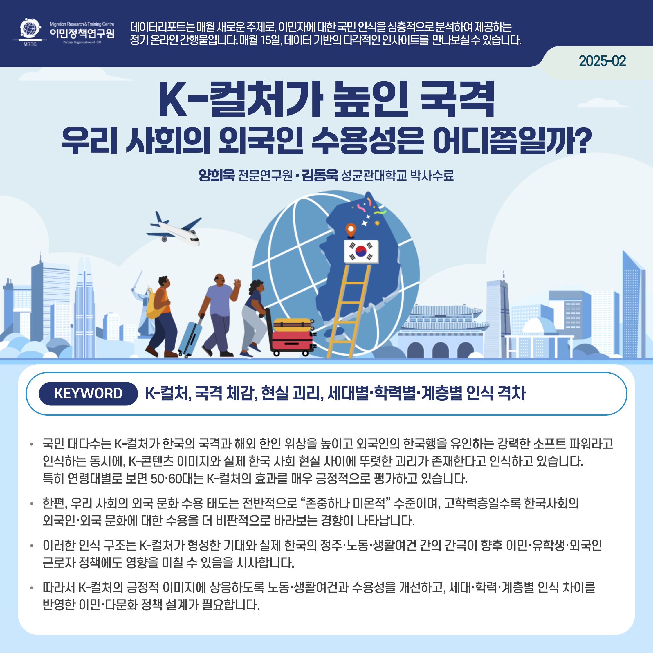 •따라서 K-컬처의 긍정적 이미지에 상응하도록 노동·생활여건과 수용성을 개선하고, 세대·학력·계층별 인식 차이를 반영한 이민·다문화 정책 설계가 필요합니다.