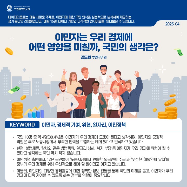 •국민 10명 중 약 4명(38.4%)은 이민자가 우리 경제에 도움이 된다고 생각하며, 이민자의 긍정적 역할은 주로 노동시장에서 부족한 인력을 보충하는 데에 있다고 인식하고 있습니다.•한편, 불법체류, 탈세와 같은 범법행위, 일자리 침해, 복지 부담 등 이민자가 우리 경제에 위협이 될 수 있다고 생각하는 국민 역시 적지 않습니다.