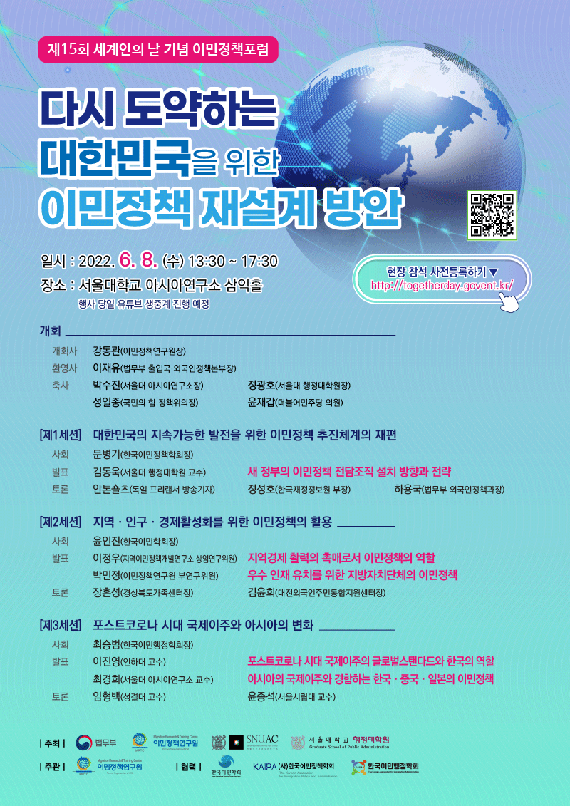 이민정책연구원에서 법무부, 서울대학교아시아연구소, 서울대학교 행정대학원과 공동으로「제15회 세계인의 날 기념 이민정책포럼」을 개최하오니, 많은 관심부탁드립니다.
