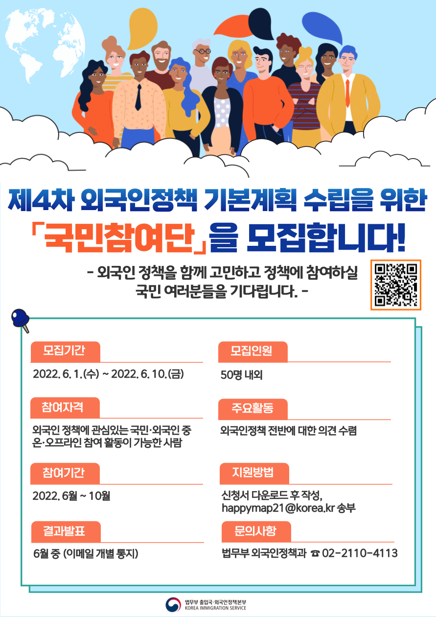 법무부 출입국·외국인정책본부에서 제4차 외국인정책 기본계획 수립을 위한 국민참여단을 아래와 같이 모집합니다.