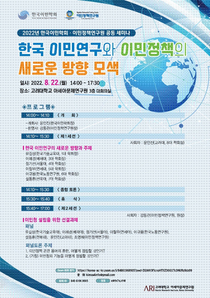 이민정책연구원과 한국이민학회가 공동으로 “한국 이민연구와 이민정책의 새로운 방향 모색”을 주제로 세미나를 개최하오니, 많은 관심부탁드립니다.