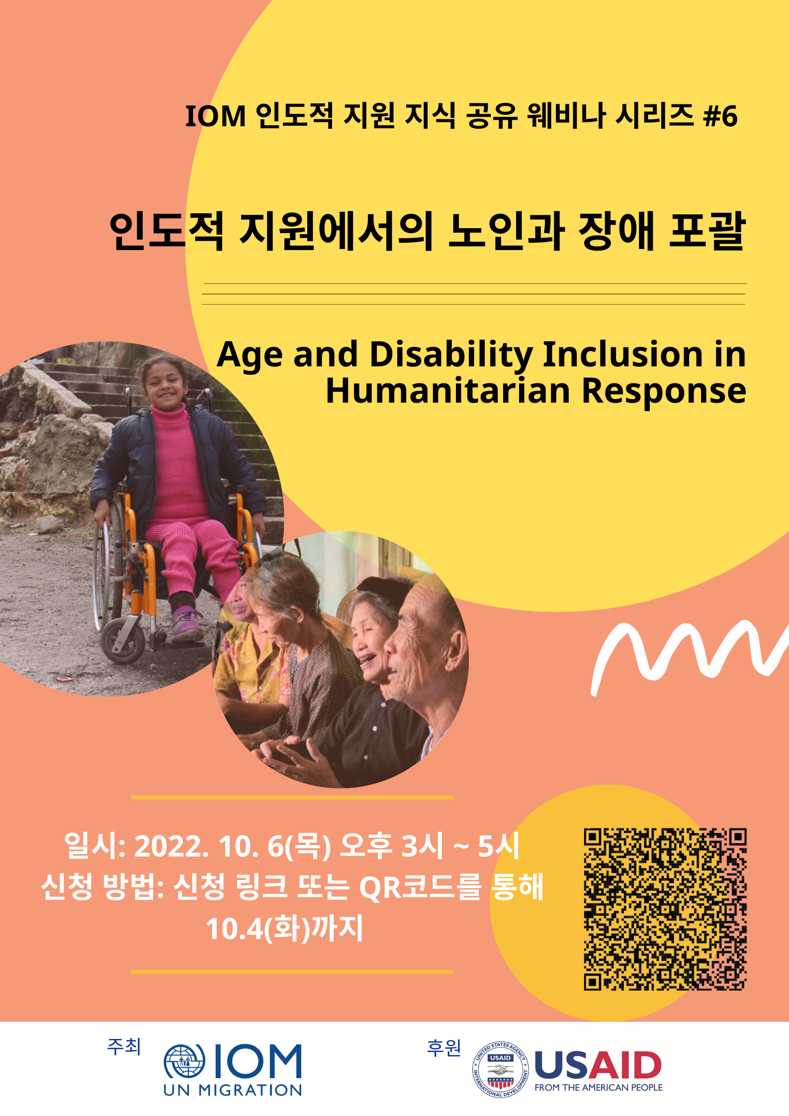 그 여섯 번째 웨비나가 오는 10월 6일 <인도적 지원에서의 노인과 장애 포괄(Webinar on Age and Disability Inclusion in Humanitarian Response)> 이라는 주제로 진행될 예정입니다.