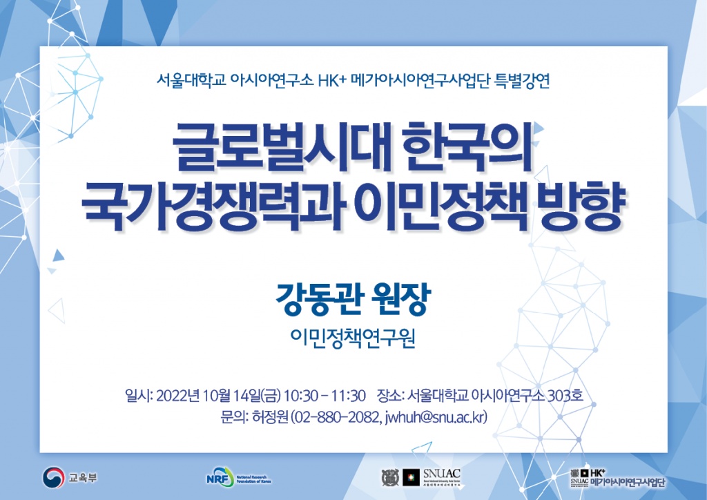 서울대학교 아시아연구소와 이민정책연구원은 상호 협력하여 국제이주와 해외지역 연구와 교육을 수행하여 다문화사회 진입을 앞둔 한국의 사회통합을 도모하고 국가 경쟁력 제고에 기여하고자 합니다. 첫 강연으로 이민정책연구원 강동관 원장님께서 저출산고령화 현상이 심화되고 있는 한국의 이민정책을 진단하고 향후 방향을 제언하는 자리를 마련하였습니다. 많은 관심과 참여 부탁드립니다.