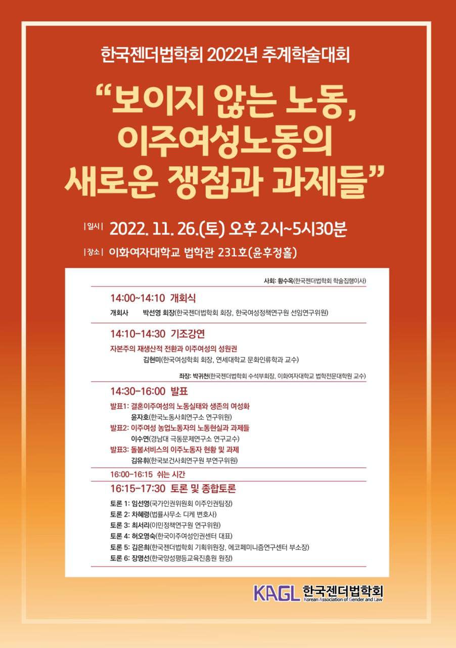 한국젠더법학회에서 아래와 같이「2022 추계학술대회」를 개최하오니, 많은 관심과 참여 부탁드립니다.