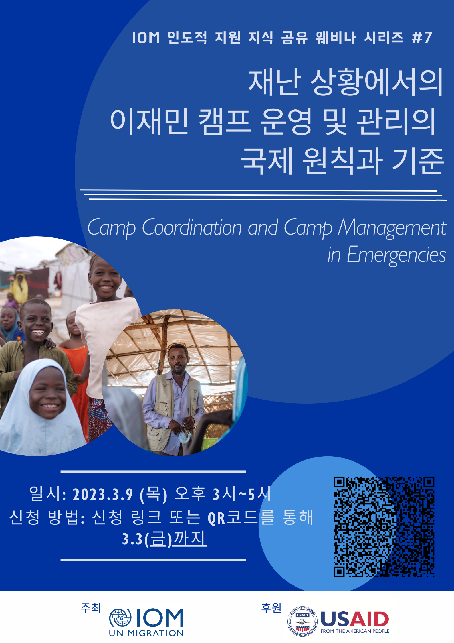 IOM 한국대표부에서는 보다 많은 분께 인도적 지원의 다양한 분야를 소개함으로써 이해를 넓히는 기회를 제공하고자 매 분기 <인도적 지원 지식 공유 웨비나 시리즈>를 진행하고 있습니다. 올해 첫 웨비나가 오는 3월 9일 <재난 상황에서의 이재민 캠프 운영 및 관리의 국제 원칙과 기준>이라는 주제로 진행될 예정입니다. 이번 웨비나에서는 IOM 남수단의 캠프 조정 및 관리, Durable Solutions 프로그램 매니저인 있는Consuelo Tangara 를 연사로 모시고 이재민 캠프 운영 및 관리(CCCM)의 국제적인 원칙과 기준을 비롯하여 다양한 인도적 지원 서비스 제공자들과의 조정과 남수단에서의 실제 사례 등을 알아보는 시간을 가지려 합니다. 보다 자세한 내용은 IOM 한국대표부 홈페이지 내 공지사항을 참고해주세요.