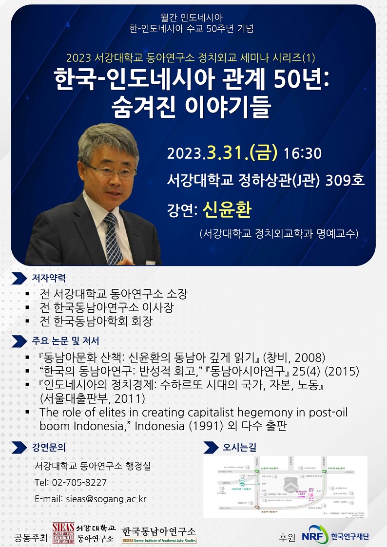 서강대학교 동아연구소는 한국연구재단의 지원으로 한-인도네시아 50주년 수교 기념으로 인도네시아 정치외교 첫 번째 강연을 진행하오니, 많은 관심과 참여 부탁드립니다.