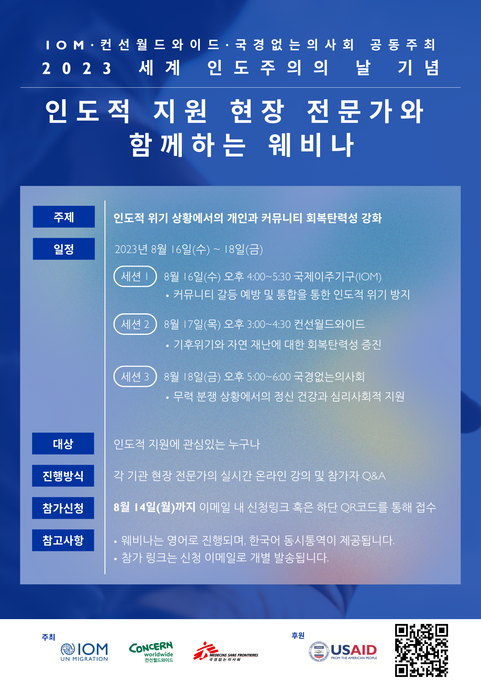 국제이주기구(IOM) 한국대표부가 2023 세계 인도주의의 날을 기념하여 컨선월드와이드 한국(Concern Worldwide Korea) 및 국경없는의사회 한국(MSF Korea)과 함께 "인도적 지원 현장 전문가와 함께하는 웨비나 시리즈"를 개최하오니, 많은 관심과 참여 부탁드립니다.