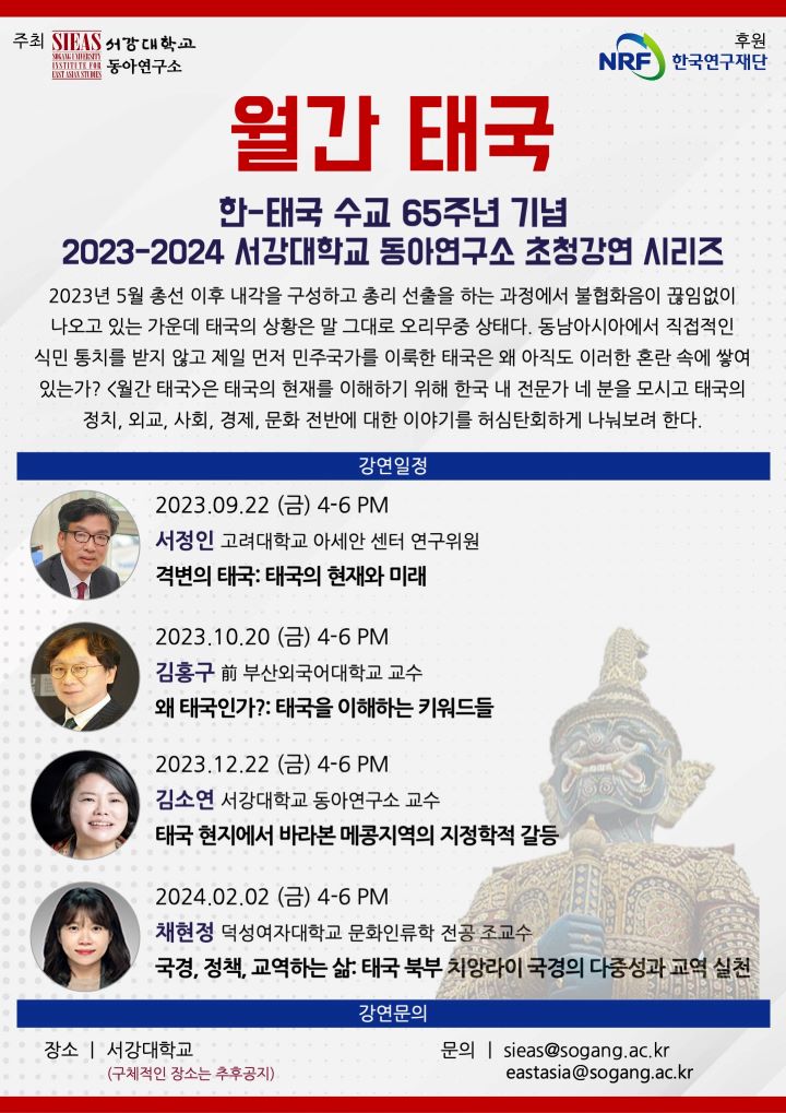 서강대학교 동아연구소에서 한-태국 수교 65주년 기념으로, 2023-2024 초청강연 시리즈를 진행하오니, 많은 관심과 참여 부탁드립니다.