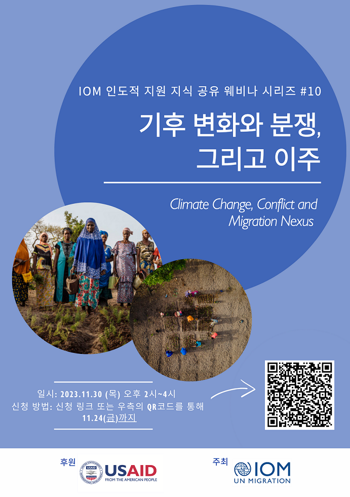 국제이주기구(IOM) 한국대표부에서 오는 제28차 유엔기후변화협약 당사국총회(COP28)의 개최일에 맞춰 11월 30일에 <기후변화와 분쟁, 그리고 이주(Climate Change, Conflict, and Migration Nexus)>라는 주제로 웨비나를 개최하오니, 많은 관심과 참여 부탁드립니다.