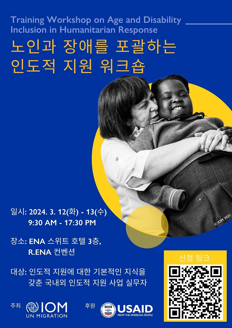 IOM 한국 대표부에서는 오는 3월 12(화)~13(수) 양일간, <노인과 장애를 포괄하는 인도적 지원> 교육 워크숍을 진행합니다.