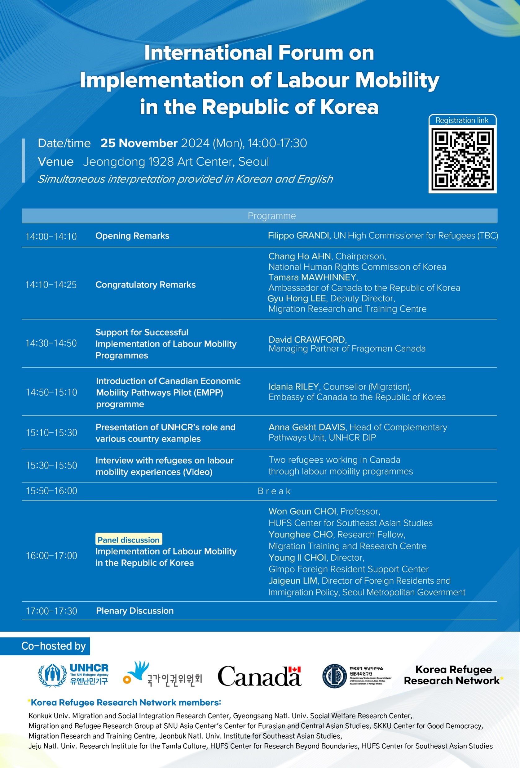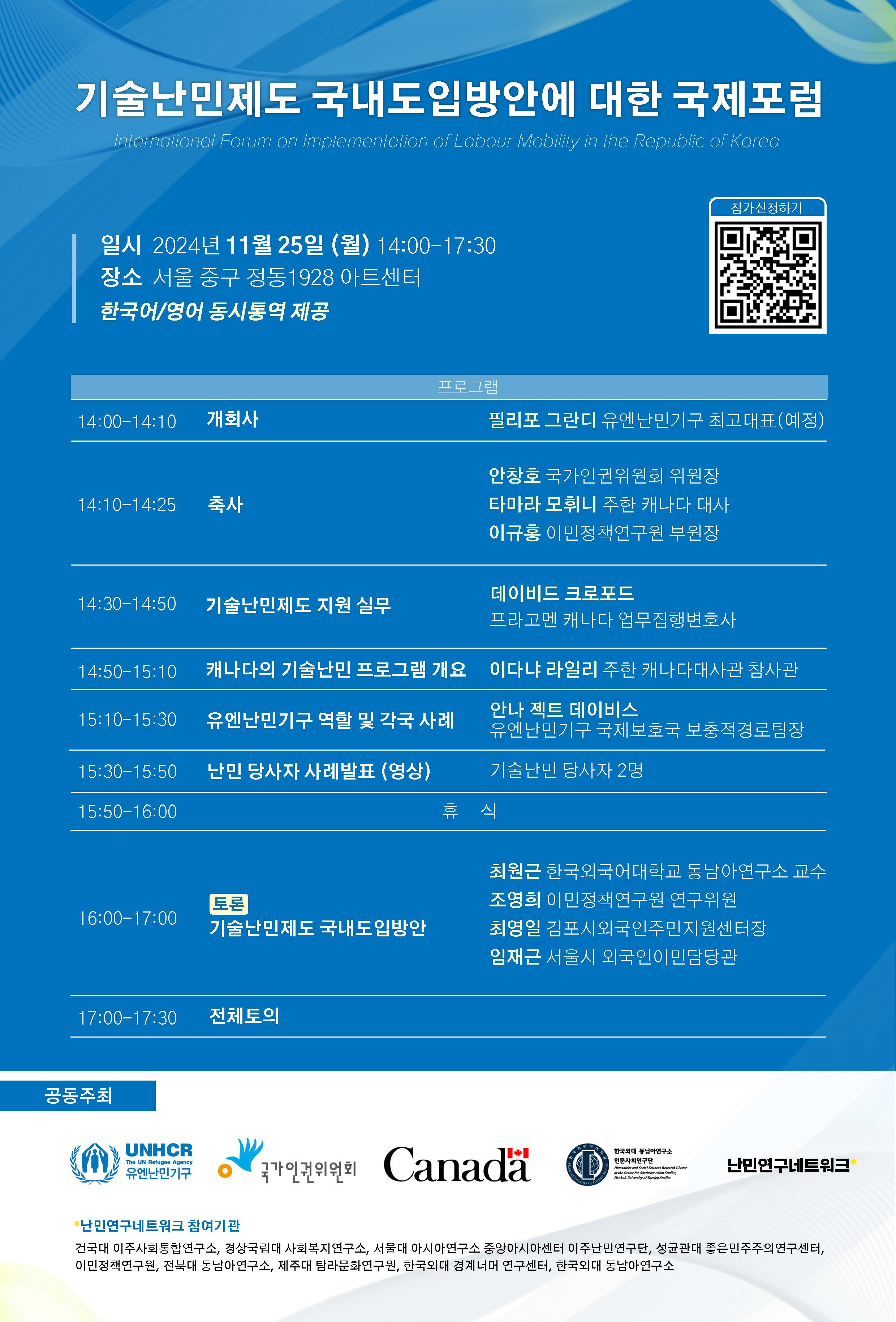 유엔난민기구, 국가인권위원회, 주한캐나다대사관, 한국외국어대학교 동남아연구소 인문사회연구단, 난민연구네트워크 공동주최 기술난민제도 국내도입방안에 대한 국제포럼을 개최하오니 많은 관심과 참여 부탁드립니다.