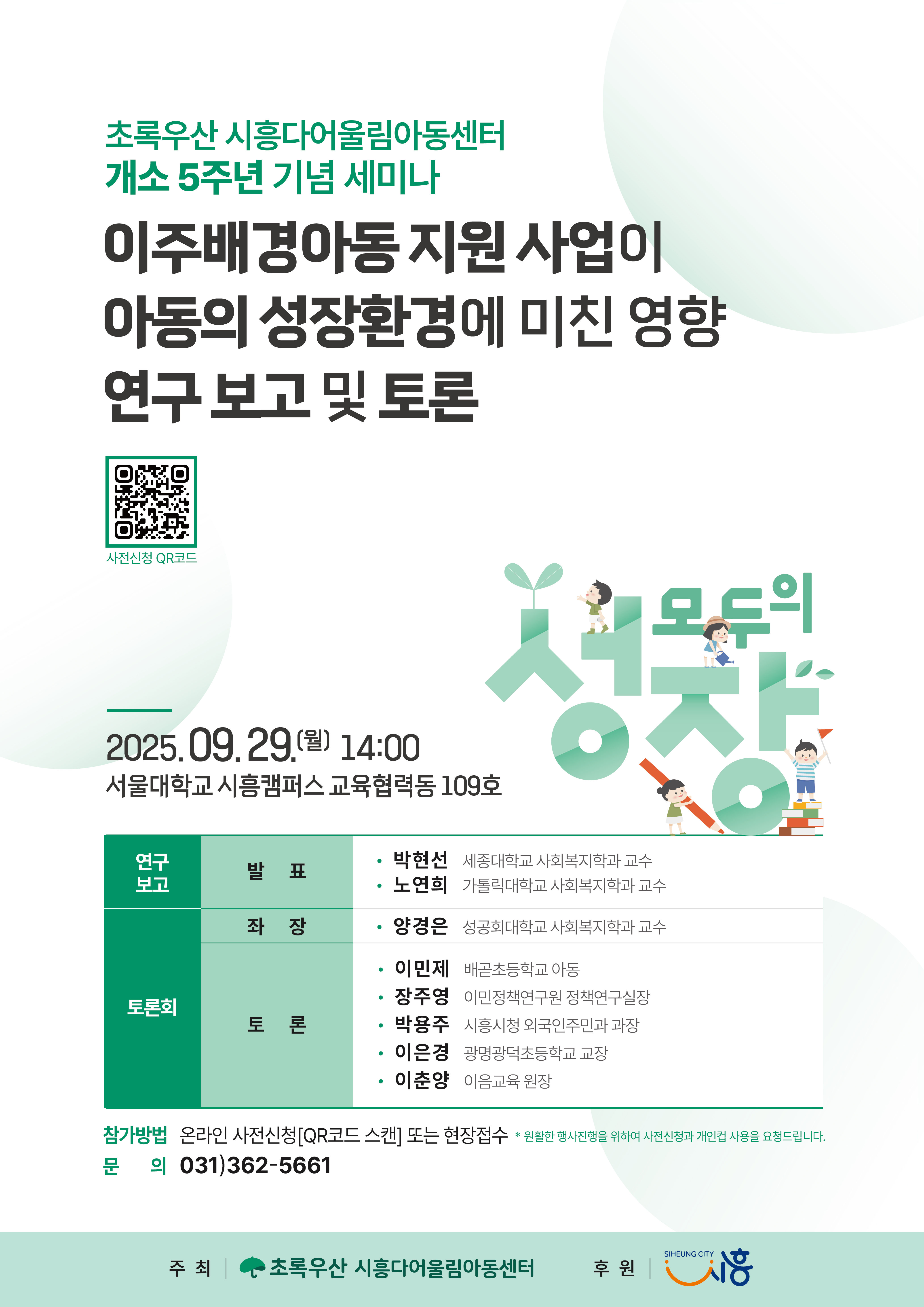 초록우산 시흥다어울림아동센터에서는 개소 5주년 세미나를[이주배경아동 지원사업이 아동의 성장환경에 미친 영향] 개최하오니 많은 관심과 참여를 부탁드립니다.