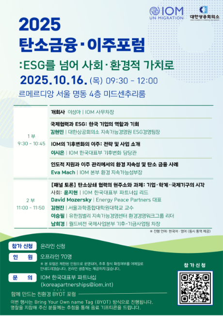 [IOM 한국대표부] <2025 탄소금융·이주 포럼: ESG를 넘어 사회·환경적 가치로> 개최 안내 ('25.10.16.)